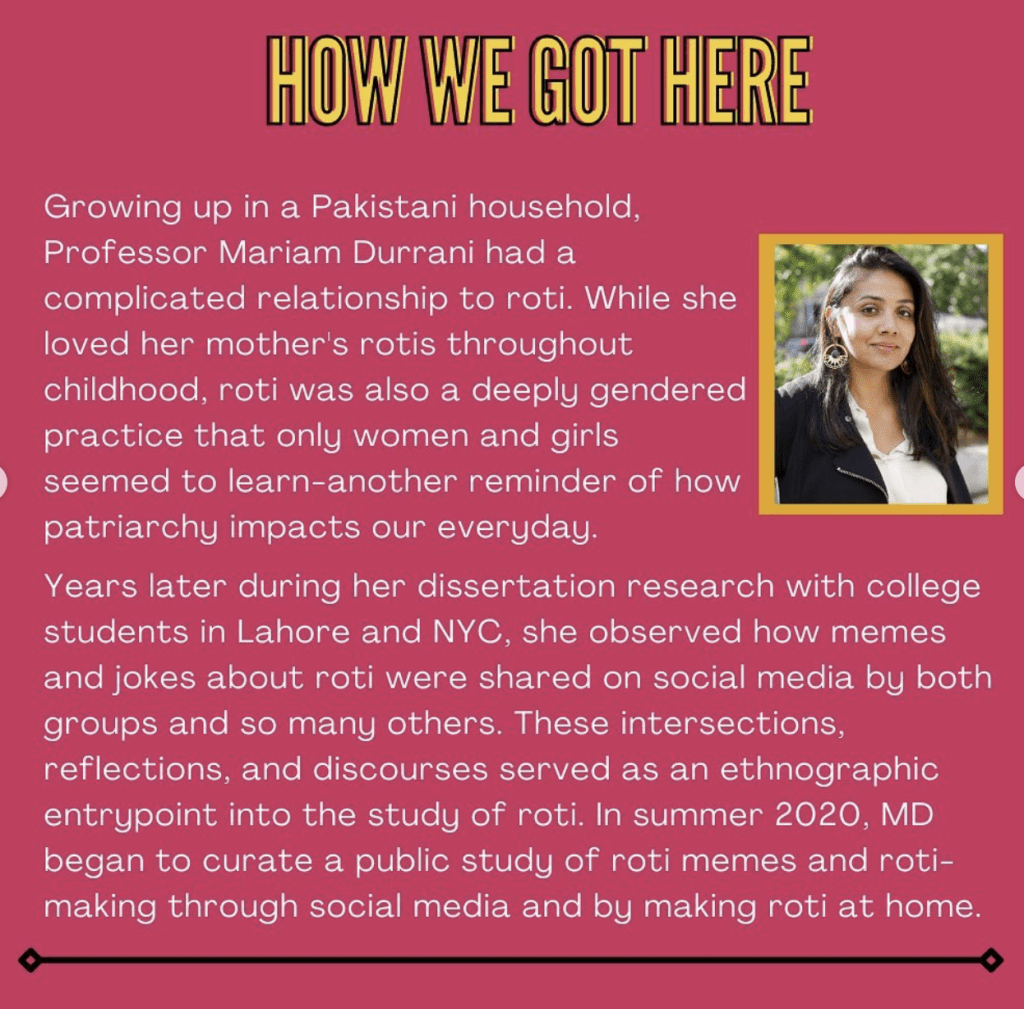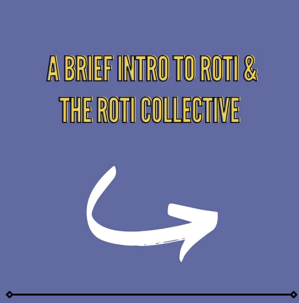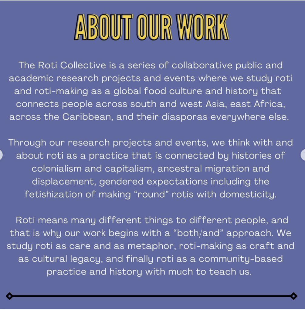 Through our research projects and evens, we think with and about roti as a practice that is connected by histories of colonialism and capitalism, ancestral migration and displacement, gendered expectations including the fetishizations of making “round” rotis with domesticity.