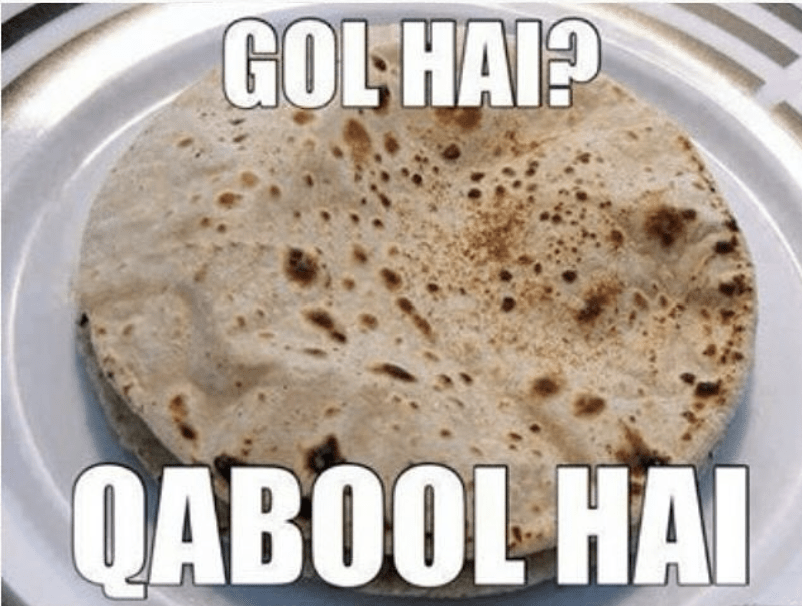 While very funny, this meme also asks us to reckon with the gendered reality of roti and roti making — a round roti is often a sign of a woman’s prowess in the kitchen, providing her to be a capable housewife, and thus worthy for marriage. In this case, the question is if the roti is round, then the marriage is accepted. Within a heterosexual couple, the meme implies the question is being asked of the woman.